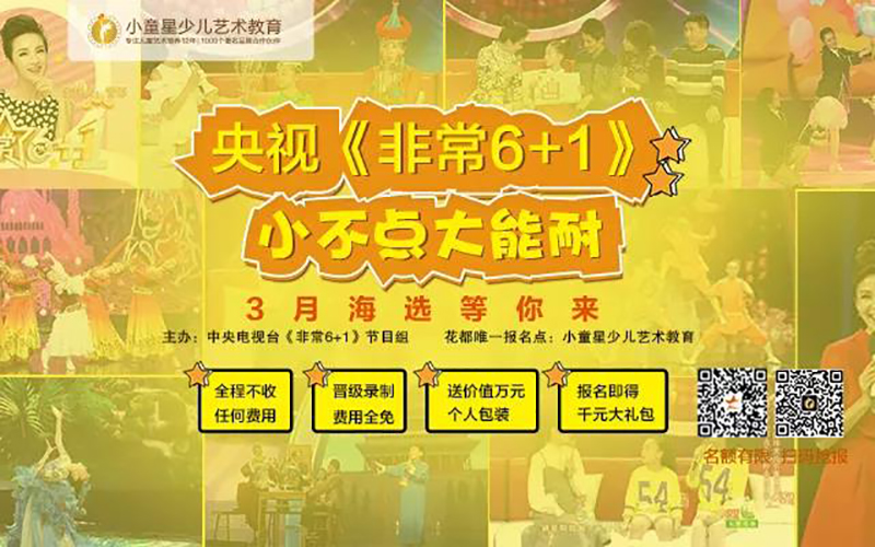 由中央电视台《非常6+1》节目组主办、小童星少儿艺术教育作为花都唯一报名点的央视《非常6+1》.《小不点大能耐》广州海选,从3月起已在全花都掀起浩浩荡荡的报名热潮。据可靠消息,本次海选全程不收任何费用!不收费!不收费!而且一旦晋级北京录制的话,不仅晋级录制全程费用全免,还送价值万元的个人包装!能给孩子这样高端的一次锻炼机会,有机会登台央视的皇牌节目,机会只有一次,赶紧报名啦!