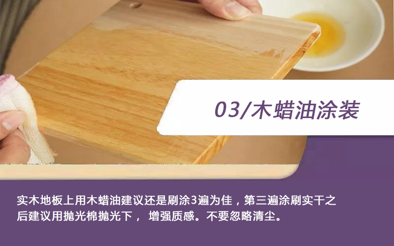 第三遍涂装:实木地板上用木蜡油建议还是刷涂3遍为佳,第三遍涂刷实干之后建议用抛光棉抛光一下,增强质感,不要忽略清尘的步骤。